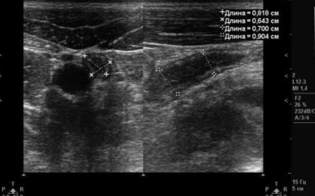 содержимым, включая анэхогенный компонент и элементы структур стенок