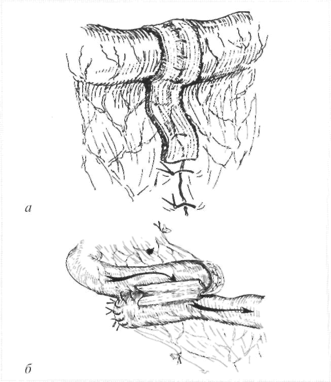 тонкокишечного анастомоза. а - наложенного конец в конец; б -